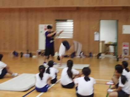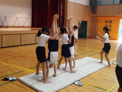 いよいよ組体操の練習が始まりました。今日は,2,3人技の組み合わせをしました。倒立の練習と飛行機の練習をしました。音楽や拍のリズムに合わせられるように安全に気を付けて練習をしていきたいと思います。