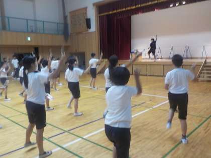 4〜6年生と一緒に民謡の「エイサー」の練習に取り組みました。曲に合わせて振付を覚え,楽しく踊っています。