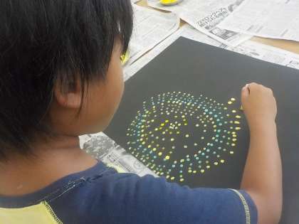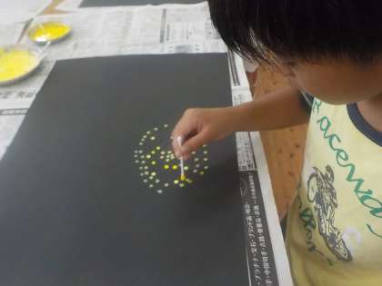 「はなびのひ」という本を読んで,絵に表しています。綿棒と絵具を使って,黒画用紙に表現しました。集中して1つ1つの点を打っていました。