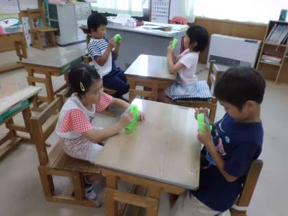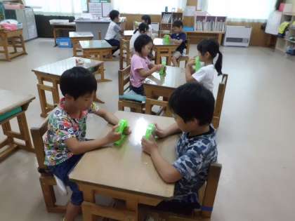 算数でとけいの学習をしました。「長いはりと短いはりがあるね。」「動く速さがちがうよ。」「何時の時は,長いはりはいつも12のところだね。」といろいろ大事なことに気づきながら時刻の読み方を学習しました。