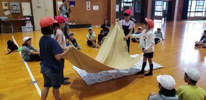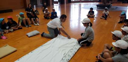 入所式の後、みさきの家の方から、みさきの家での約束や寝具の準備の仕方について、説明していただきました。この後、今夜寝るバンガローに行って、明るいうちに寝る準備をします。
