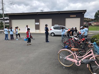 6年生の自転車キャンプは,予定より少し早く出発しました。塔の公民館に到着,休憩している様子です。