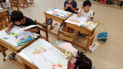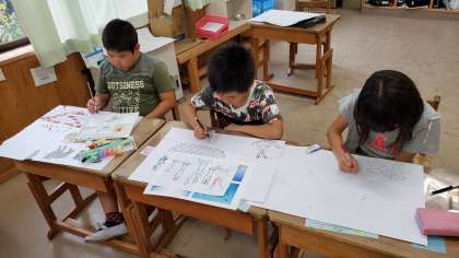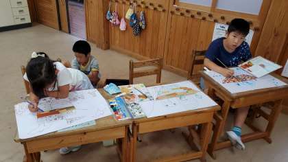 ヤマネコが手作りで作った船で,お話では,船室のドアは空の色ということになっています。船体の板一枚一枚丁寧に色を塗っていました。