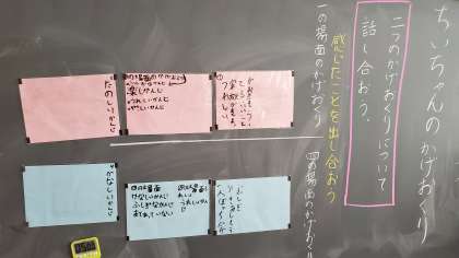 1の場面は「楽しい」「家族がまとまっている」という感じで,4の場面は「悲しい」「不思議な感じ」などの意見が出ました。