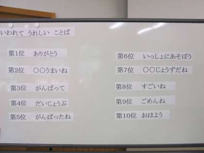 さて,今日は「ほっとデイ」。上地先生から「いわれてうれしいことば」についてお話をしていただきました。全国でアンケートをとった結果の上位10位をみんなに紹介してくださいました。相手がうれしい気持ちになる言葉をみんなで大切にしていきたいですね。