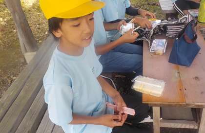 宇津峡公園では,お弁当を食べました。早起きして自分で作ったサンドイッチを,おいしくいただき,元気いっぱい出発しました。