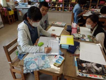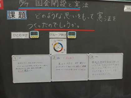 今日の社会科の学習は「どのような思いをもって憲法をつくったのでしょうか」という課題で学習を進めました。江戸時代では「将軍中心」の政治でしたが,明治時代になるとどのように変化したのかをグループで話し合いました。