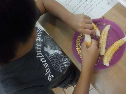 収獲し乾燥させたたトウモロコシの種を1つ1つ取り外しました。この種を使ってポップコーンパーティをします。