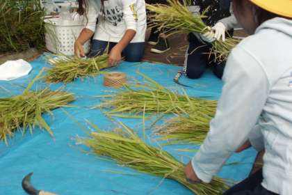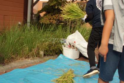 一人10株ほどずつでしたが協力して刈りとりを終え,束ねました。後片付けもしっかりできました。乾燥後どのようにして白米となるのか手作業ならではの行程も学んでいきます。