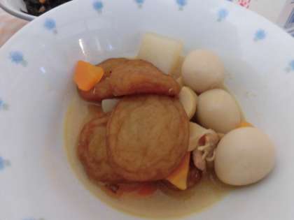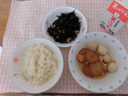 今日のきゅう食はひらてんとこんにゃくのにつけでした。見た目はひら天のちゃいろにんじんのオレンジお肉の白色などいろんな色がありました。にんじんがやわらかかったです。あじはやさしいあじでした。(2年生)