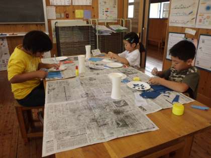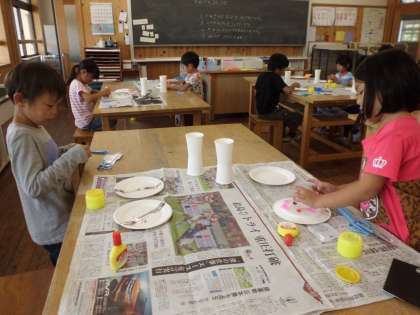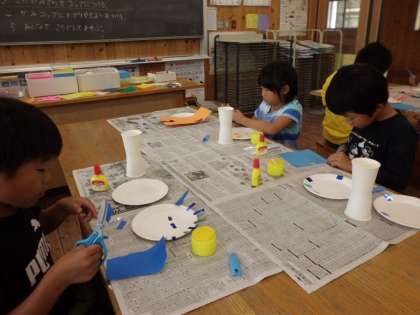 紙皿と紙コップを使って,転がるおもちゃ作りをしました。思い思いの飾りや模様を紙テープや色紙,カラーテープを使って貼り付けていきました。次の時間に完成させて,みんなで転がして遊びたいと思います。
