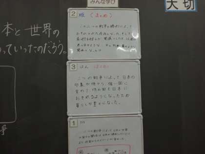 今日の社会科の学習は「2つの戦争から,日本と世界の国々との関係はどのように変わっていったのだろうか」という課題で学習を進めました。日清・日露戦争の勝利によって,今までの日本のイメージが世界の国々がどのように変化したのかをグループで話し合いました。