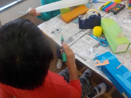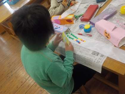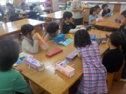 1年生と一緒に図画工作科の時間に「なにがでてくるかな」というテーマで作品を作りました。膨らませて出てくるものを想像しながら,楽しく作ることができました。最後の鑑賞の時間には,グループで工夫した点や感じたことを交流しました。
