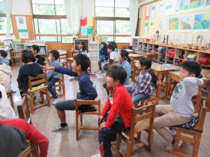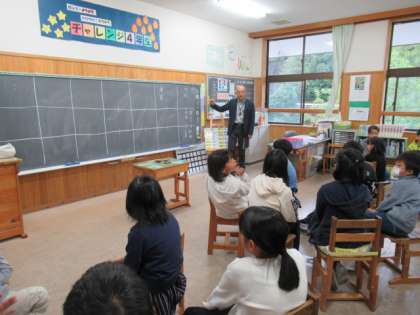 合同学習の1時間目は国語「漢字しりとりをしよう」の学習に取り組みました。三校の4年生26人が5つのグループに分かれて,チーム戦で競いました。どのグループも,制限時間40秒以内にたくさんの熟語が書けるよう,友達と教え合いながら楽しむことができました。