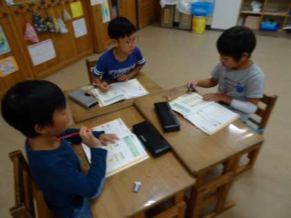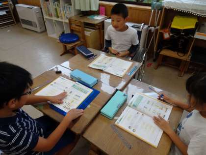 グループで協力して,「学びを生かそう」の問題に挑戦しました。これまでに学習した,長さ・かさ・たし算とひき算の筆算を思い出しながら問題を解いていました。
