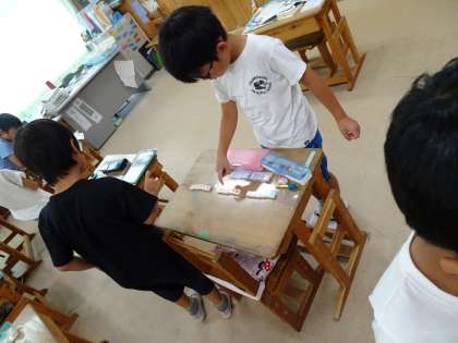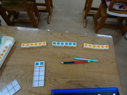 かけ算の学習が始まりました。まずは,かけ算のしくみを理解することが大切です。今回は,もとになる数のいくつ分なのかをブロックをつかって表し,答えを求めました。