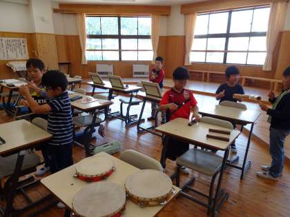 音楽では,「だがっきパーティ」という曲を鑑賞しました。その曲に使われている7つの打楽器が,どんな音なのか,どう演奏するのかを確かめて,お気に入りの楽器を見つけました。