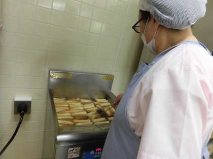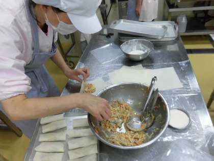 春巻は手作りです。ひとつひとつ丁寧に給食室で巻いて作ります。