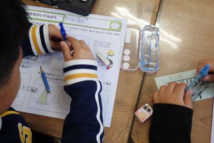 算数の時間,コンパスを使って三角形を描く練習をしています。コンパスの使い方にも慣れ,どの児童も正確に三角形を描くことができるようになりました。