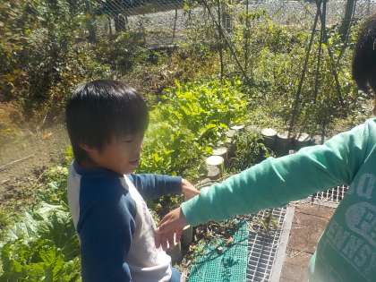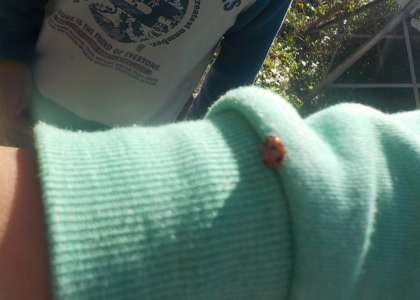 畑で野菜の世話をしていると,テントウムシがあらわれました。しばらく服の上を歩き回っている姿をかわいがりながら観察しました。