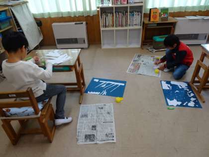 白い画用紙をいろいろな形に切り,切った形を並べて作品を作りました。「ペンギンに見える!」「これは,らくだかな?」と切った形から想像を膨らませていました。