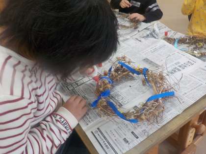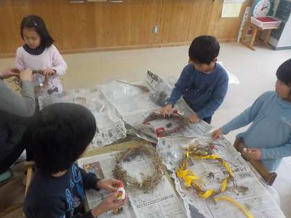後半には,アサガオのツルを使ったリース作りをしました。飾りつけの材料を譲り合いながらみんなで楽しく作品作りができました。