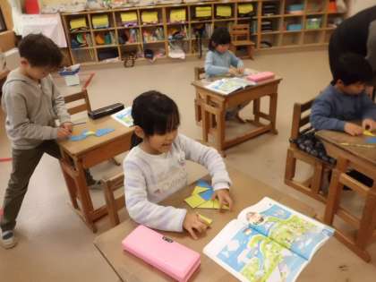 三角形のの色板や棒を使って形作りをしました。角を合わせたり,どの向きに置くと同じ形になるのかを考えるのがとても難しかったです。