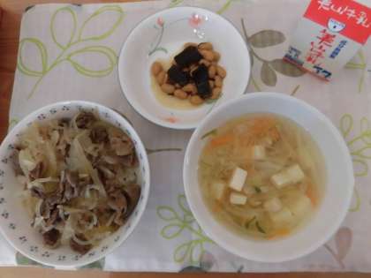 今日の給食はぎゅうどんでした。見た目はお肉とこんにゃくのあいしょうがよかったです。かおりはにくのかおりがしました。ふれたようすはすこしかたいかんじでした。味はおいしかったです。気持ちはもっといっぱい食べたいなという気持ちになりました。(5年生)