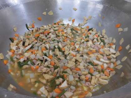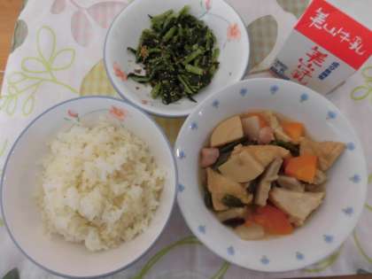 給食では厚揚げ鶏肉・にんじん・三度豆・たけのこ・しいたけ・こんにゃくをじっくり煮て作りました。