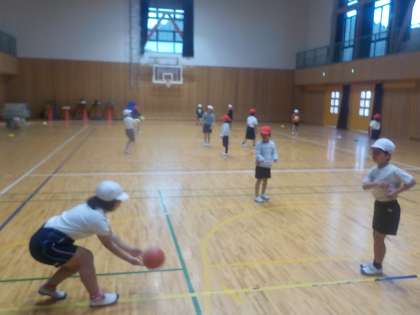 体育の学習でパスゲームに取り組んでいます。パスをキャッチしたり,パスをもらいやすい場所に移動したりすることを工夫してゲームを楽しみました。