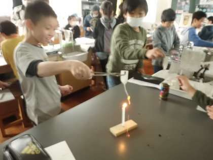 12月20日(金)午後から周山中学校オープンスクールに参加しました。5校時は体験授業です。5年生は理科の授業でした。理科室で線香花火を作りました。正確に薬品を計量し,よく混ぜて火薬をつくり,その火薬を半紙に包んでこよりにして火をつけると「パチパチ」と本物の線香花火が完成しました。