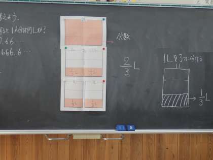 1月9日(木)分数の学習に入りました。今までは,「1Lを3つに分けるとどうなるか」を考えてきましたが,今日は,「2Lを3つに分けるとどうなるか」を考えました。