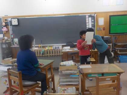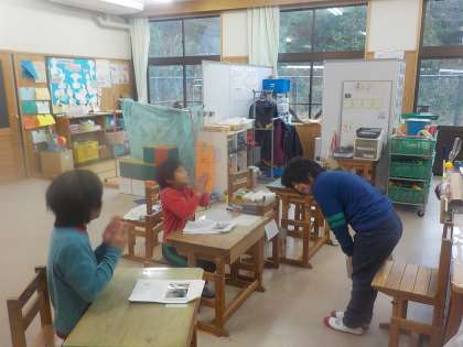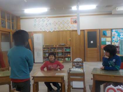 冬休みの思い出を発表し合って感想や,質問をしました。楽しい思い出を話して3人とも笑顔になりました。