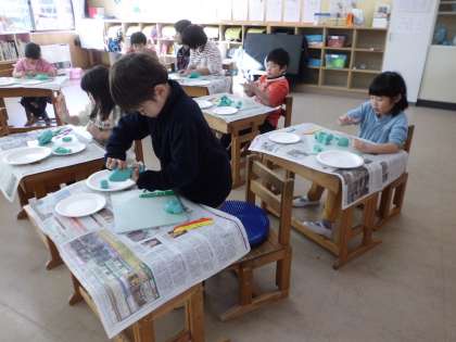 粘土を使って美味しそうなごちそうをいっぱい作りました。ピザ,オムライス,おすし,たこ焼き,ケーキ,アイスクリーム等でお皿がごちそうでいっぱいになりました。