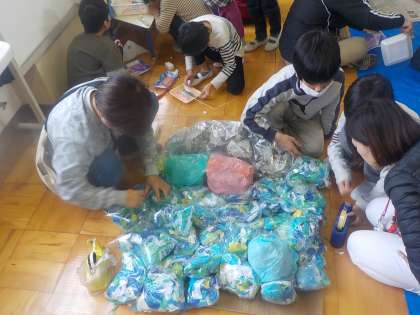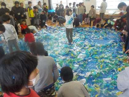 広沢小学校で右京北支部の合同作品作りに取り組みました。今年は,海をテーマにお花紙を使って大きな海を作って遊び,ビニール袋に入れて波も作りました。