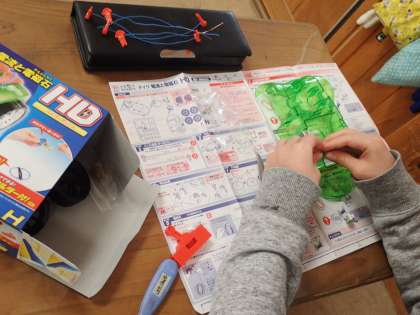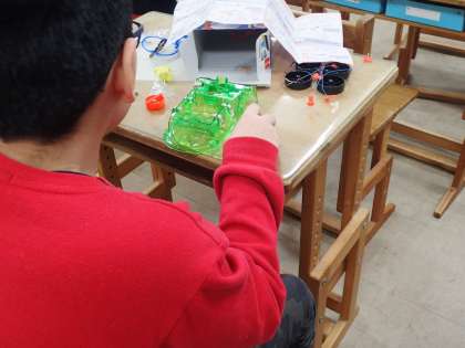 理科では「電磁石」の学習をしています。電池ボックスに金属をさしこみ,「導線に電気が流れるとどうなるか」を実験する準備をしています。実験の準備が早くできた子は,まだできていない友だちに教えるなど,協力して活動しています。
