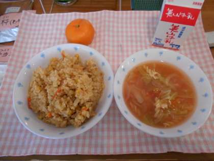 ・今日の給食はカレーピラフでした。スパイシーなかおりが口の中に広がりました。コーンがシャキッとして甘くてカレーの風味とお米が合っていました。とてもおいしかったです。また食べたいなぁと思いました。(6年生)