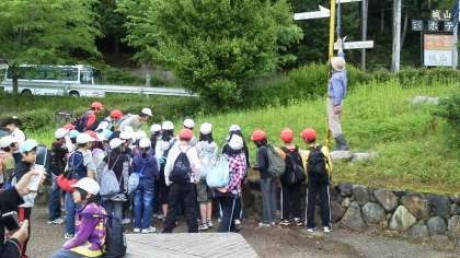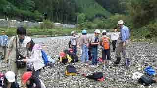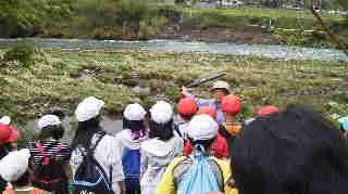 河原での観察の様子です。先生のお話をしっかり聞いて観察しています。