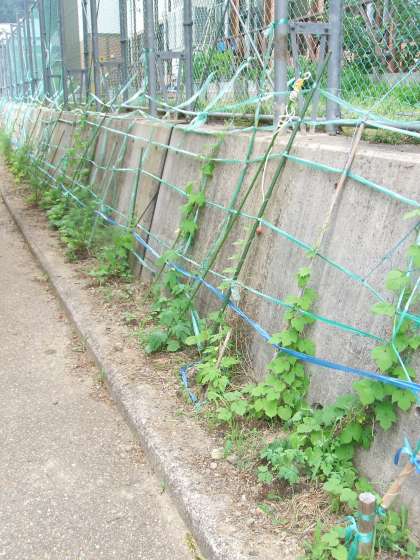 5月から取り組んでいる「緑のカーテン」。学校の裏でゴーヤ(ツルレイシ)とアサガオを育てています。グングンとは言えませんが,少しずつ成長しています。これから太陽の恵みを受けて大きくなっていくことでしょう。