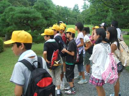 8月27日(土),5・6年生の希望者22名が,京都市内の名所を見学に行きました。古都京都の歴史や文化に直接ふれることで,子どもたちの学習意欲をさらに高めることができました。二条城〜平安神宮〜動物園〜金閣寺と巡りました。子どもたちは事前に配られたテキストを参考にしながら,興味深くそれぞれの建造物などを熱心に見入っていました。ジュニア京都検定でも今日の学習を生かして頑張ってくれると思います。