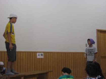 国語で学習した狂言の柿山伏を発表しました。登場人物は山伏と柿主の二人。それを交代しながら全員で演じました。言い回しが昔風なので暗記するのも一苦労でしたが,子ども達の熱心な演技に低学年にもなんとなく伝わったのではないかなあと思います。