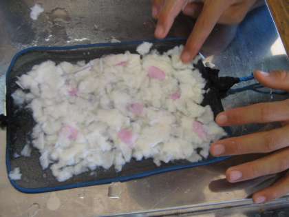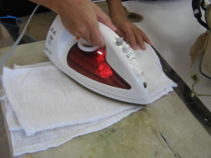 先週にちぎった牛乳パックは水にふやかされどろどろになっていました。そこへ洗濯のりをまぜて,先週作った「針金ハンガー紙すき」で,はがきサイズに紙をすきました。事前にとっておいた花びらや葉っぱを織り交ぜて,アイロンをかけました。現在,乾燥中です。アイロンをかけているのできちんとひらたくなり,文字が書ける「和紙はがき」になっていると思います。