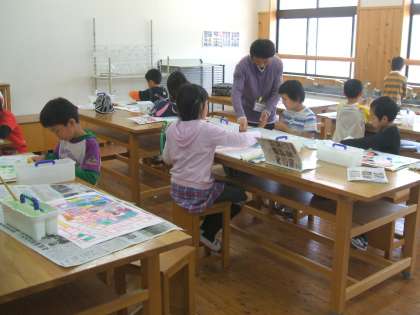 3校時,図工室では3年生がパスと絵の具を使って作品作りに励んでいます。それぞれパスで描いた線に絵の具で色を塗っています。すてきな作品ができそうです。
