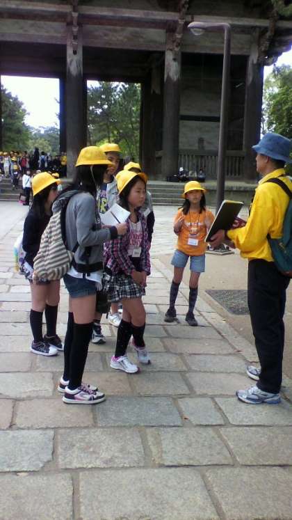 東大寺に到着しました。全員元気にグループに分かれて古の都ならを見学しています。写真は南大門の説明を受けているところです。