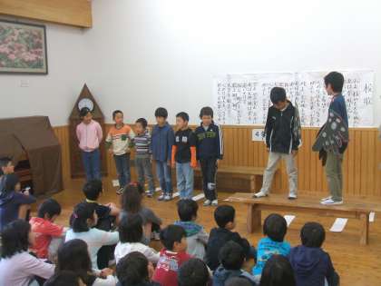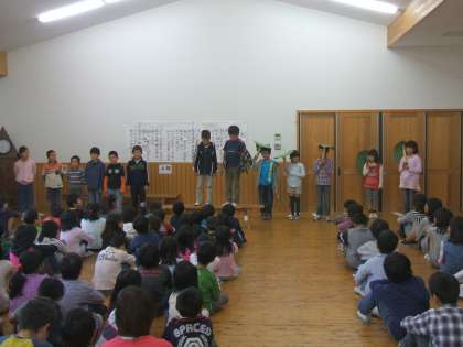 今日の朝会は,3年生が『きつつきの商売』を暗唱しました。それぞれが役割を持って一生懸命発表しました。最後は,自分たちが考えた動物の商売を紹介しました。