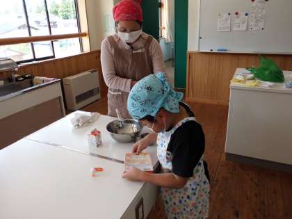 ひかり学級では,2か月に1回程度,クッキングの機会を設定しています。今回は,遠足でスタートからゴールまでみんなと一緒に歩き通したことをお祝いするためのクッキングでした。