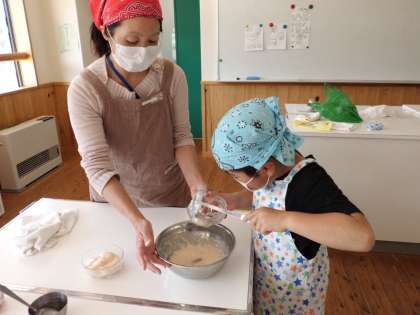 牛乳をデザートの素と混ぜるレシピですが,準備から片付けまで,先生方の力を借りながらも,自分でやりました。