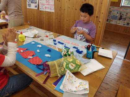 いろいろな紙。布やわた。身の回りの材料を使って,絵に表しています。来週2時間の授業で,完成させたいと思います。