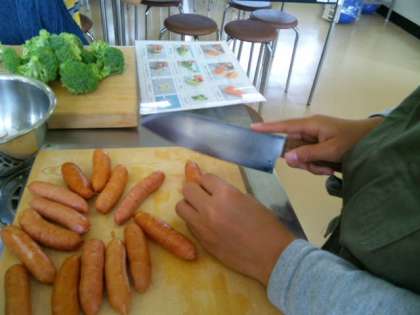 今日の最初の活動です。伝統食(ほおばごはん)や山菜の天ぷらの調理開始です。「食改健康しゃくなげ」の方々に教えていただきます。おいしくできるかな。