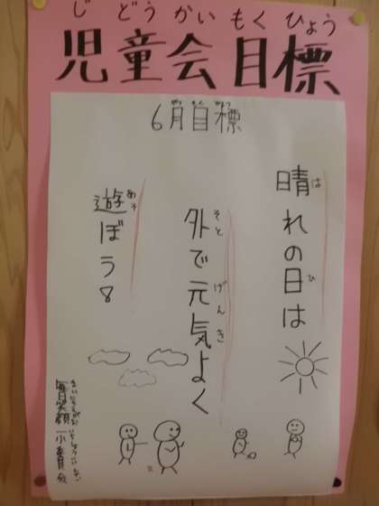 毎日笑顔一小委員会のお友達が,今月の目標を考えて校内に掲示してくれました。晴れた日は外で元気に体を動かし,雨が降ったら心静かに読書に取り組んでほしいです。